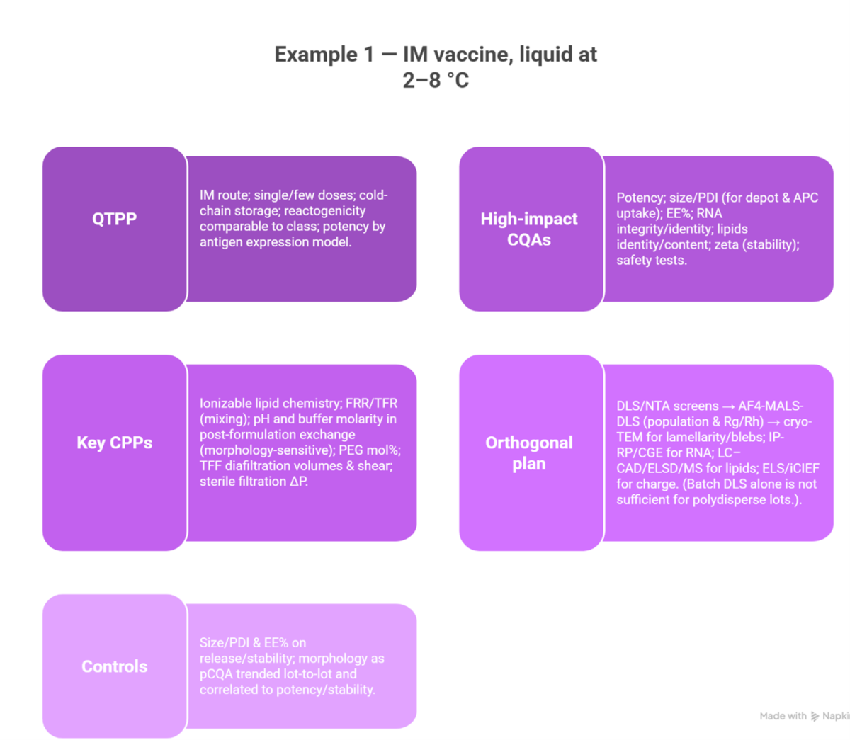 Escalation rule. Promote any attribute to release CQA only when it shows a reproducible CPP→CQA→ performance link, with a control window you can hold in GMP. Morphology becomes a defensible lever when backed by structural insights and robust correlations to function as implemented in platforms like NanoVation’s lcLNPs, where morphology supports pharmacokinetic goals and enables extrahepatic tissue delivery.