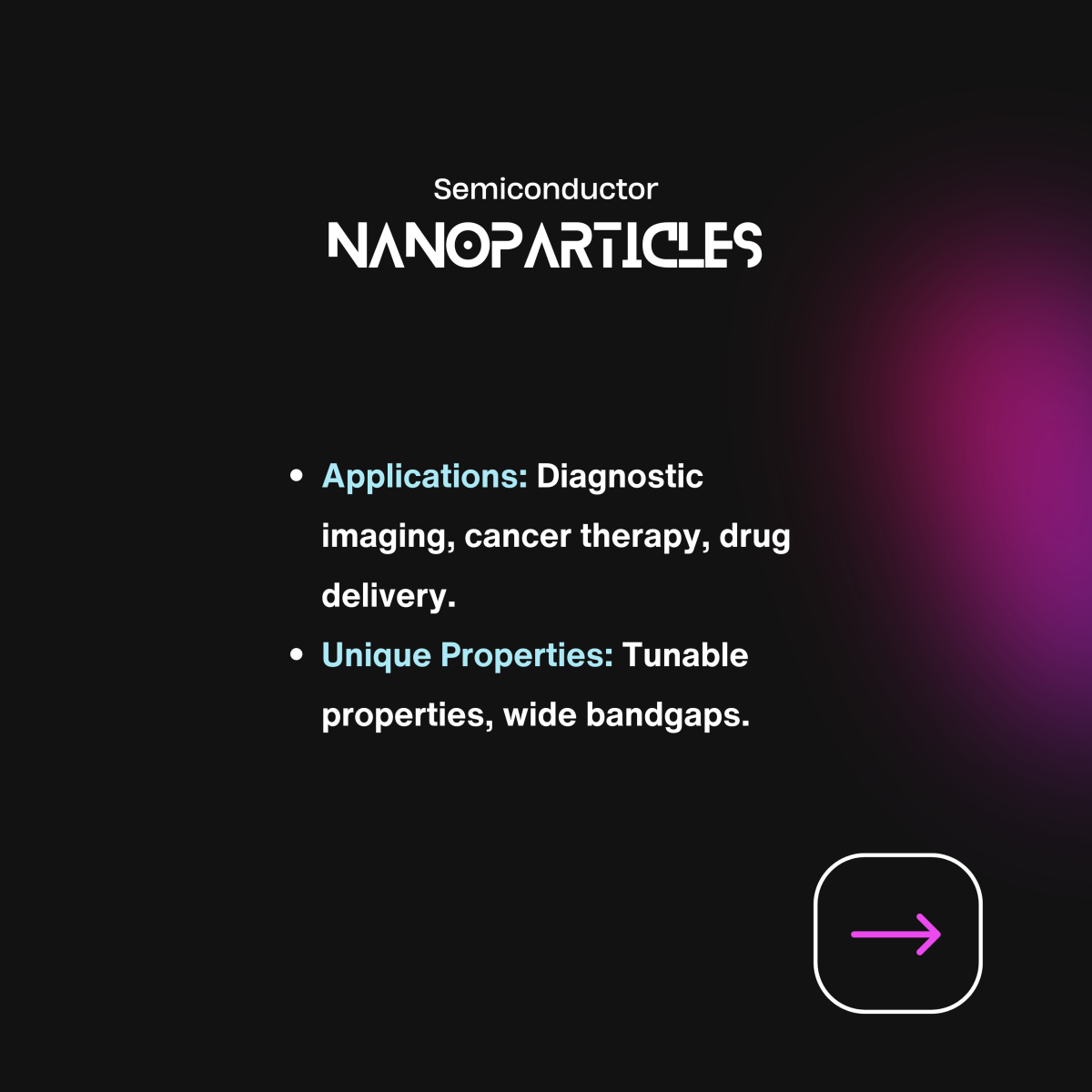 Semiconductor nanoparticles have properties intermediate between metals and non-metals and belong to groups II-VI, III-V, or IV-VI in the periodic table. Examples include GaN, GaP, InP, InAs (III-V), ZnO, ZnS, CdS, CdSe, CdTe (II-VI), and silicon and germanium (IV).